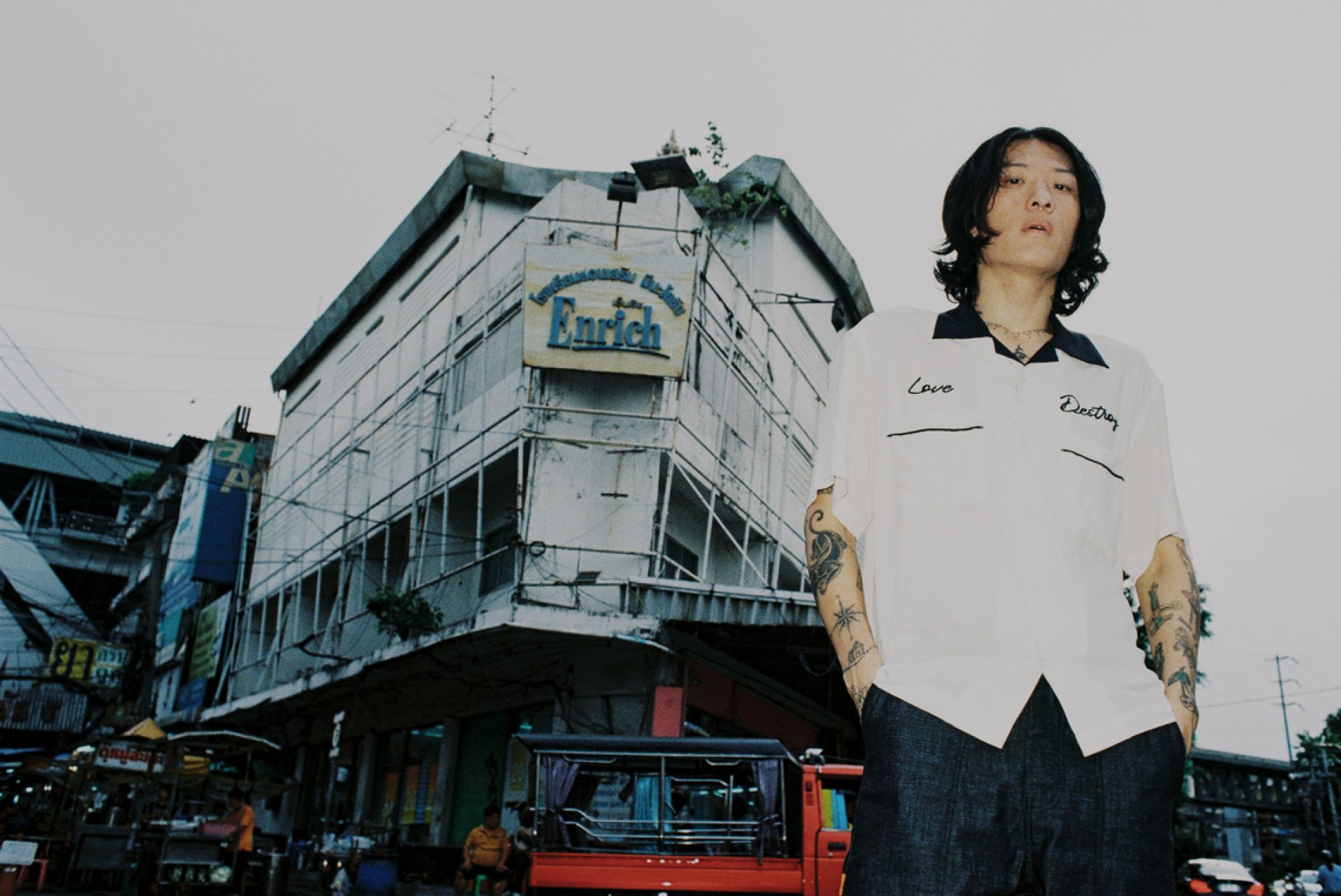 เราได้เพื่อนที่เป็นช่างภาพแฟชั่นมาถ่ายคอลเลคชั่นนี้ ภายใต้คอนเซปของความเป็นเมืองที่วุ่นวาย มีความเจริญแต่ก็ผุพังไปพร้อมๆกัน